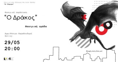 *Η θεατρική ο μάδα του Πολιτιστικού Συλλόγου Φοιτητών Ξάνθης, διοργανώνει τη θεατρική παράσταση “Ο Δράκος” του Swartz και σας προσκαλεί να απολαύσετε κι εσείς μαζί της αυτή τη διαφορετική πλευρά των πραγμάτων. Την Τετάρτη 29 Μαΐου, στο αμφιθέατρο Κ. Καραθεοδωρή και ώρα 20.00 να είστε όλοι εκεί!
