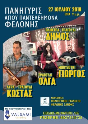 *Πανηγύρι 2. Παρασκευή 27 Ιουλίου στη Φελώνη το πανηγύρι του Οικισμού για την γιορτή του Αγίου Παντελεήμονα. Γλέντι και χορός με την υποστήριξη VALSAMIS CATERING Τραγούδι-Λύρα Κώστας, Τραγούδι Όλγα, Μπουζούκι-Γιώργος.