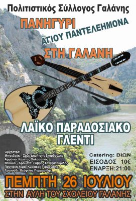 *Πανηγύρι 1ο . O Πολιτιστικός Σύλλογος Γαλάνης διοργανώνει την Πέμπτη 26 Ιουλίου στην Αυλή του Σχολείου Γαλάνης Πανηγύρι του Αγίου Παντελεήμονα στη Γαλάνη με ΛΑΪΚΟ ΠΑΡΑΔΟΣΙΑΚΟ ΓΛΕΝΤΙ Catering ΒΙΩΝ και είσοδο 10 ευρώ