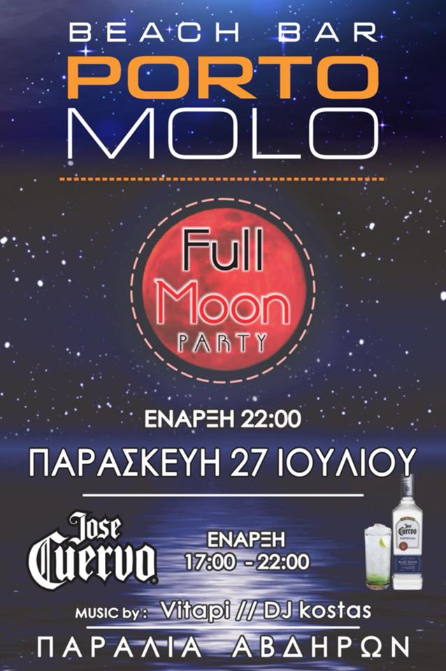Το Porto Molo Beach Bar που φημίζεται για τα party που διοργανώνει σε κάθε πανσέληνο, σας υποδέχεται την Παρασκευή 27 Ιουλίου για το απόλυτο Full Moon Party !