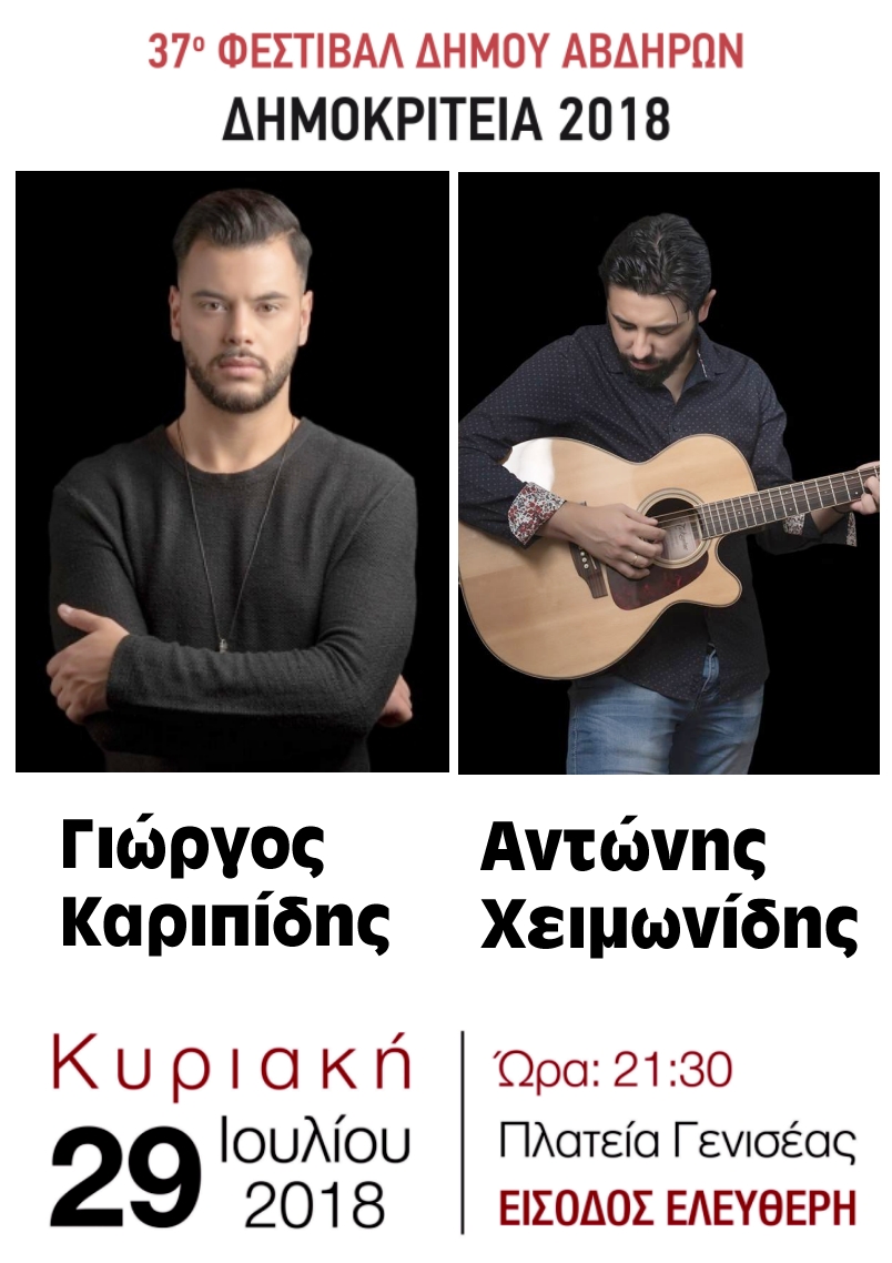 Την Κυριακή 29 Ιουλίου στις 21:30 στην Πλατεία Γενισέας ο Γιώργος Καριπίδης, ο Αντώνης Χειμωνιδής και η ορχήστρα τους σας υπόσχονται μία καταπληκτική βραδιά. Να είστε όλοι εκεί!