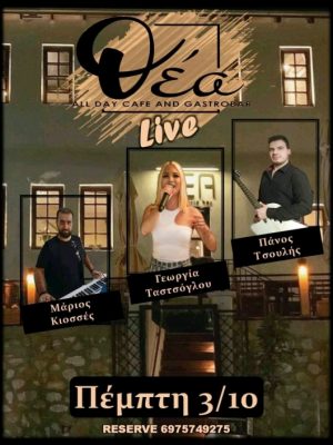 «Πέμπτη 3 Οκτωβρίου ξεκινάμε τα live της χειμερινής σαιζόν σε ένα απο τα καλύτερα μαγαζιά της πόλης… «Θέα» all day cafe bar, με νέο πρόγραμμα και αγαπημένα τραγούδια».