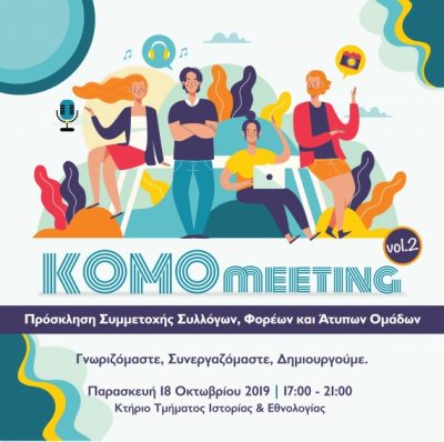 *Το Κέντρο Ευρωπαϊκής Πληροφόρησης Europe Direct Κομοτηνής σε συνεργασία με τον Δήμο Κομοτηνής την Παρασκευή 18 Οκτωβρίου 2019 και ώρα 17:00 – 21:00 θα πραγματοποιήσουν για δεύτερη συνεχή χρονιά την εκδήλωση «KOMOmeeting», στο κτίριο του τμήματος Ιστορίας και Εθνολογίας του ΔΠΘ (κτίριο παλιάς Νομικής).