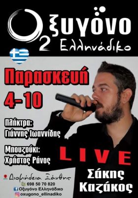 *Το Οξυγόνο ελληνάδικο στην Διομήδειασας περιμένει σήμερα στο πρώτο του live με τον Σάκη Καζάκο!