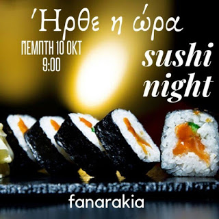 *Μη το χάσετε! Από αυτή την Πέμπτη 10 Οκτωβρίου και κάθε Πέμπτη από τις 21:00 το βράδυ, ξαναέρχονται οι βραδιές «Sushi Nights» στην ταβέρνα «ΤΑ ΦΑΝΑΡΑΚΙΑ» στον πεζόδρομο Γ. Σταύρου 18 στην Ξάνθη, για να μας συναρπάσουν γευστικά με συνταγές από την Άπω Ανατολή!