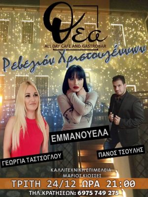 *Υπέροχο ρεβεγιόν για τα Χριστούγεννα ετοιμάζει η ΘΕΑ στην πλατεία Αντίκα με τα αστέρια Εμμανουέλα, Γεωργία Ταστσόγλου και Πάνος Τσούλης με την καλλιτεχνική επιμέλεια του Μάριου Κιοσσέ.
