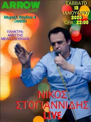 *Αυτό μη το χάσετε. Στο Arrow café στην Μιχαήλ Βόγδου 4 το Σάββατο 18 Ιανουαρίου ο συνθέτης και τραγουδιστής του ΤΡΑΚΤΕΡ Νίκος Στογιαννίδης τραγουδάει live. Πλήκτρα Ανέστης Μελισσόπουλος.
