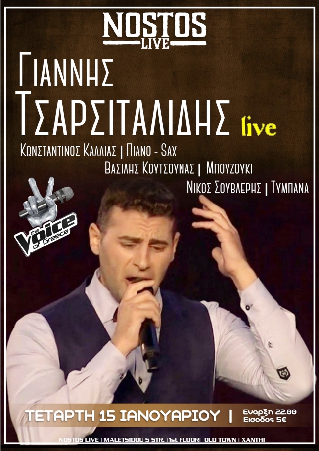 Ο Γιάννης Τσαρσιταλίδης μετά την επιτυχημένη είσοδο του στο Voice, έρχεται την Τετάρτη 15 Ιανουαρίου για μια μοναδική εμφάνιση στην γενέτειρα του στην Ξάνθη στο Nostos Bar.