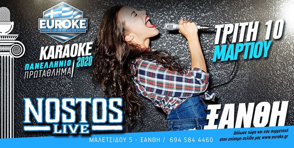 Την Τρίτη 10 Μαρτίου στις 10 το βράδυ, έρχεται στο Nostos στην Ξάνθη (Μελετσίδου 5 –Παλιά Πόλη) ο 1ος προκριματικός του Πανελλήνιου Πρωταθλήματος ΚΑΡΑΟΚΕ 2020!