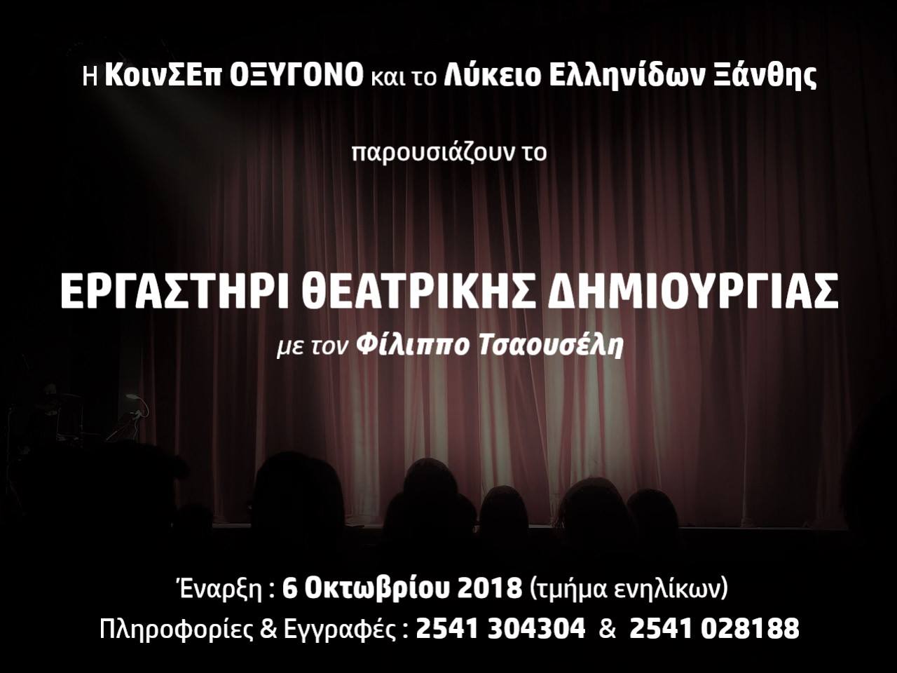 Η ΚοινΣΕπ ΟΞΥΓΟΝΟ ανοίγει την νέα δημιουργική σεζόν με την επίσημη συνεργασία της με το Λύκειον των Ελληνίδων Ξάνθης στο Εργαστήρι Θεατρικής Δημιουργίας.