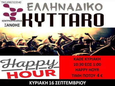 * Αυτή την Κυριακή και κάθε Κυριακή «happy hour» στο KYTTARO ελληνάδικο από τις 22:30 μέχρι τη 01:00 μετά τα μεσάνυχτα με τιμή ποτού μόνο 4 ευρώ!