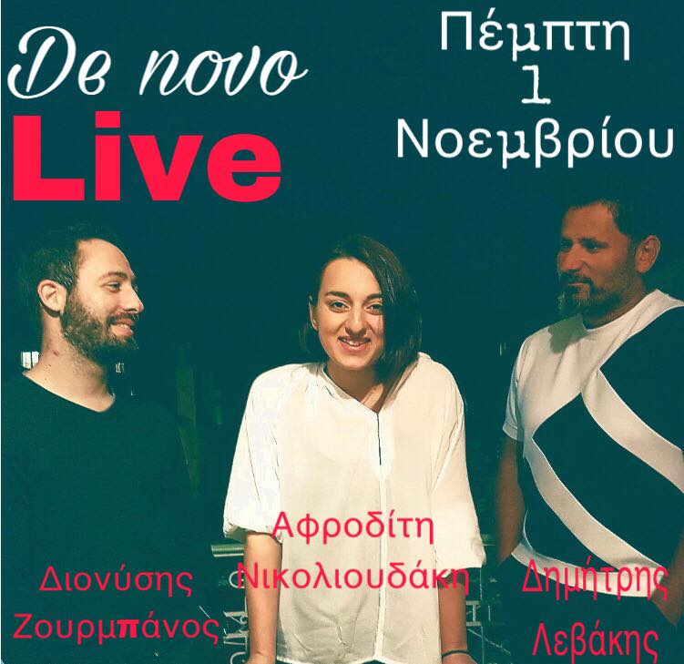 Live με τους Διονύσης Ζουρμπάνος, Αφροδίτη Νικολιουδάκη και Δημήτρης Λεβακης.. σήμερα στο De Novo. Όλοι εκεί για μια αξέχαστη βραδιά!!
