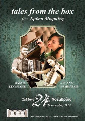 *Αυτό το Σάββατο 24 Νοέμβρη μη χάσετε στο kafe bar Θέα (Βασιλέως Κωνσταντίνου 43 Ξάνθη) την Χρύσα Μωραϊτη καιτους “tales from the box”! Μια συναυλία έκπληξη!