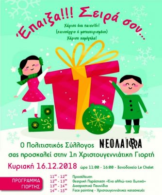 Την Κυριακή 16 Δεκεμβρίου από τις 11 στο ξενοδοχείο Le Chalet με θέατρο, διαδραστικά παιχνίδια, face painting, χριστουγεννιάτικες κατασκευές και πολύ παιχνίδι σε μια διοργάνωση του Πολιτιστικού Συλλόγου ΝΕΟΛΑΙΡΑ!