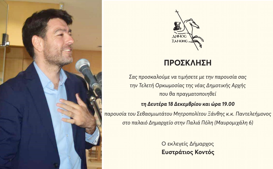 Σήμερα Δευτέρα 18 Δεκεμβρίου και ώρα 19.00 θα γίνει η ορκωμοσία της νέας Δημοτικής αρχής και του νέου Δήμαρχου Ξάνθης Στράτου Κοντού στο Δημαρχιακό Μέγαρο, στην κεντρική πλατεία της Ξάνθης.