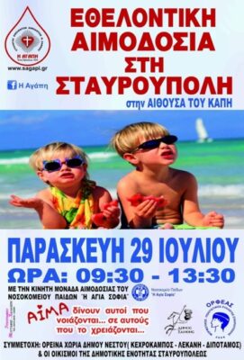 Στην Αίθουσα του ΚΑΠΗ Σταυρούπολης 09.30 έως 13.30 θα γίνει ΕΘΕΛΟΝΤΙΚΗ ΑΙΜΟΔΟΣΙΑ την Παρασκευή 29 Ιουλίου 2022 από την Κινητή Ομάδα του Νοσοκομείου Παίδων «Η ΑΓΙΑ ΣΟΦΙΑ» και ιδού και η ανάρτηση του Αλέξανδρου Μουστακίδη)