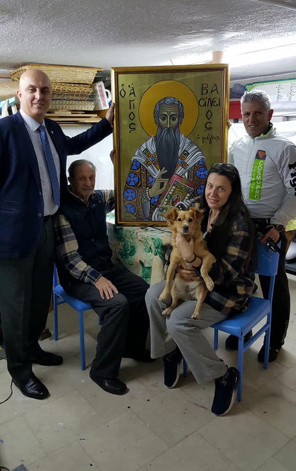 Η ζωγράφος Φιφή Χατζηστόϊκου μπροστά στον εικόνα του Αγίου Βασιλείου που ζωγράφισε η ίδια