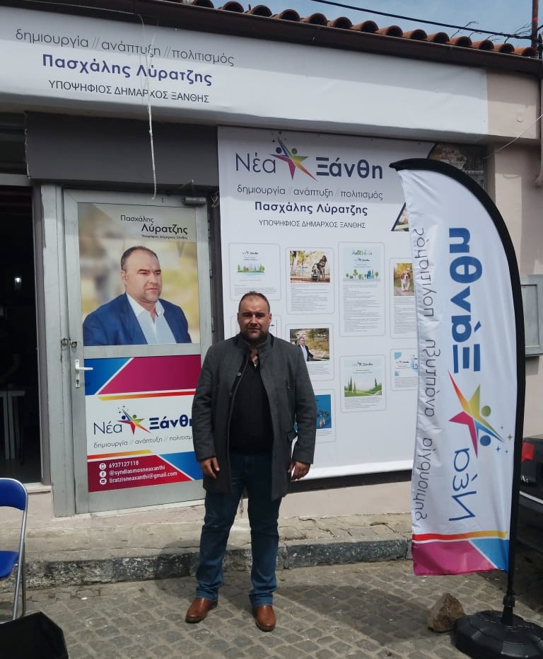 Ο Υποψήφιος Δήμαρχος Ξάνθης Πασχάλης Λύρατζης χθες το μεσημέρι, μπροστά στο πανέμορφο εκλογικό του κέντρο.