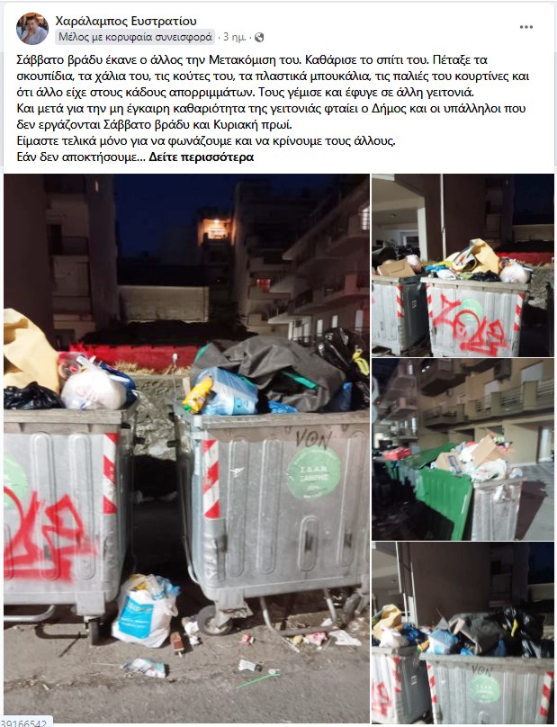 Και μετά για την μη έγκαιρη καθαριότητα της γειτονιάς φταίει ο Δήμος και οι υπάλληλοι που δεν εργάζονται Σάββατο βράδυ και Κυριακή πρωί.
