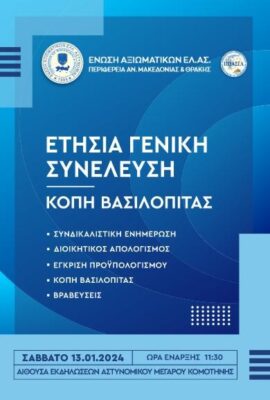 Η Ένωση Αξιωματικών Ελληνικής Αστυνομίας Ανατολικής Μακεδονίας και Θράκης, σας προσκαλεί να παρευρεθείτε στην Ετήσια Γενική Συνέλευση – Kοπή βασιλόπιτας, που θα πραγματοποιηθεί το Σάββατο 13 Ιανουαρίου 2024 και ώρα 11.30΄, στην αίθουσα εκδηλώσεων του αστυνομικού μεγάρου Κομοτηνής (Λεωφ. Δημοκρατίας 3). Κατά τη διάρκεια της εκδήλωσης, θα πραγματοποιηθεί: