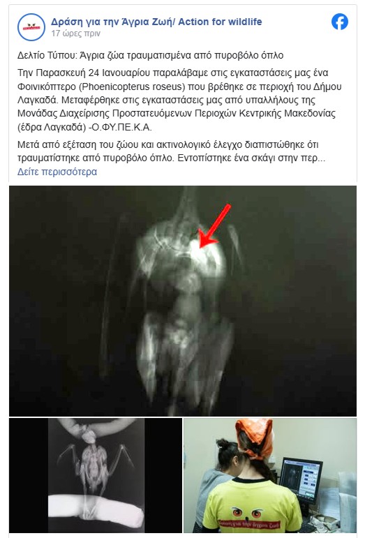 Πυροβολημένο στο στέρνο μεταφέρθηκε για περίθαλψη στις εγκαταστάσεις της Δράσης για την Αγρια ζωή, ένα φοινικόπτερο (Phoenicopterus roseus) που είχε βρεθεί σε περιοχή του δήμου Λαγκαδά από υπαλλήλους της Μονάδας Διαχείρισης Προστατευόμενων Περιοχών Κεντρικής Μακεδονίας.