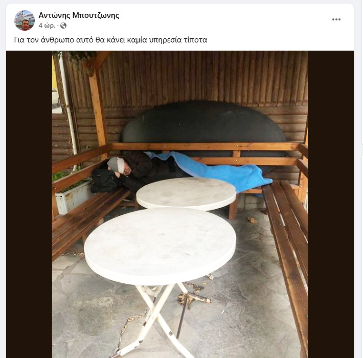 (Από ανάρτηση του Αντώνη Μπουτζωνη για άστεγο που βρήκε καταφύγιο σε υπόστεγο καφέ της πόλης…)