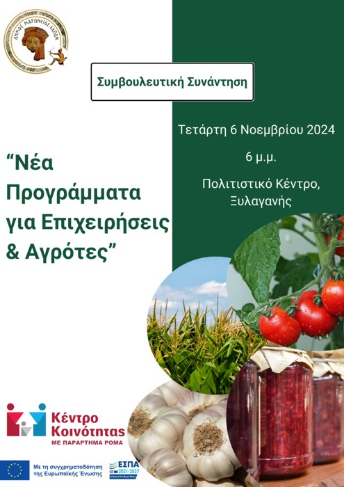 Η Συμβουλευτική Συνάντηση θα πραγματοποιηθεί στην Ξυλαγανή, με θέμα «Νέα Προγράμματα για επιχειρήσεις και Αγρότες», την Τετάρτη 06 Νοεμβρίου και ώρα 18:00 μ.μ. στο Πολιτιστικό Κέντρο Ξυλαγανής.