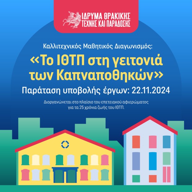 Το Ίδρυμα Θρακικής Τέχνης και Παράδοσης ανακοινώνει την παράταση της περιόδου υποβολής έργων για τον Καλλιτεχνικό Μαθητικό Διαγωνισμό «Το ΙΘΤΠ στη γειτονιά των Καπναποθηκών» έως την Παρασκευή 22 Νοεμβρίου.
