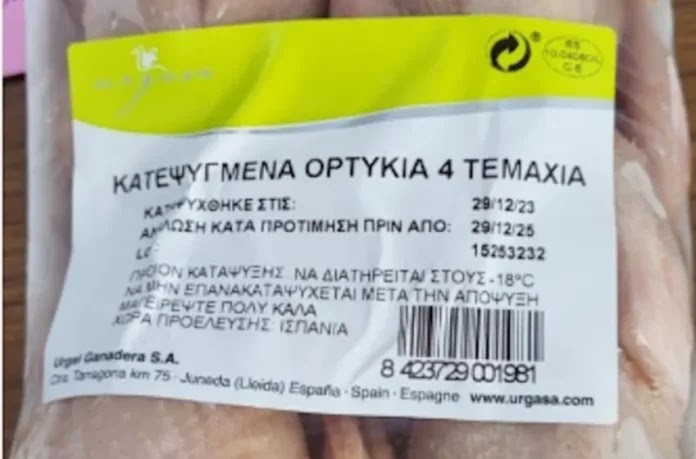 Στην ανάκληση κατεψυγμένων ορτυκιών προχώρησε ο Ενιαίος Φορέας Ελέγχου Τροφίμων λόγω ανίχνευσης σαλμονέλας. Συγκεκριμένα, ο Φορέας και ειδικότερα η Περιφερειακή Διεύθυνση Ηπείρου κατά τη διενέργεια ελέγχων προέβη σε δειγματοληψία κατεψυγμένου κρέατος ορτυκιού, με την εμπορική ονομασία «ΚΑΤΕΨΥΓΜΕΝΑ ΟΡΤΥΚΙΑ 4 ΤΕΜΑΧΙΑ» με αριθμό παρτίδας LOT:15253232, ημερομηνία κατάψυξης 29/12/2023 και ημερομηνία ανάλωσης κατά προτίμηση 29/12/2025, το οποίο παράγεται στην Ισπανία από την επιχείρηση Urgel Ganadera SA.