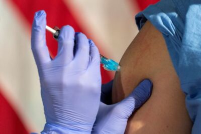 In front of an American flag, nurse Lillian Wirpsza administers a COVID-19 vaccine to Shylee Stewart, a labor and delivery nurse at George Washington University Hospital, in Washington, D.C., U.S. December 14, 2020. Jacquelyn Martin/Pool via REUTERS