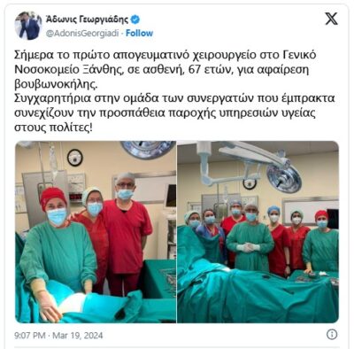 «Σήμερα το πρώτο απογευματινό χειρουργείο στο Γενικό Νοσοκομείο Ξάνθης, σε ασθενή, 67 ετών, για αφαίρεση βουβωνοκήλης.