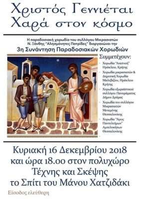 Χορωδιακή συνάντηση από τον Σύλλογο Μικρασιατών Ξάνθης, την Κυριακή 16 Δεκεμβρίου στον Πολυχώρο Μάνος Χατζιδάκις