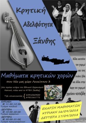 Από την Κρητική Αδελφότητα Ξάνθης ανακοινώθηκε ότι την Κυριακή 16 και τη Δευτέρα 17 Σεπτεμβρίου ξεκινούν τα μαθήματα κρητικών χορών της φετινής περιόδου, με το ακόλουθο πρόγραμμα: