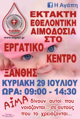 Καλούμε όλους τους συμπολίτες μας να δώσουν αίμα, στην Εθελοντική Αιμοδοσία που θα πραγματοποιηθεί την Κυριακή 29 Ιουλίου από τις 9:00 έως 14:30 στην αίθουσα του Εργατοϋπαλληλικού Κέντρου Ξάνθης.