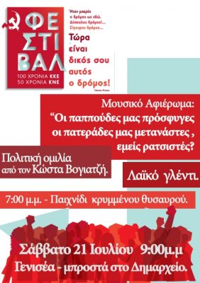 Με προφεστιβαλική εκδήλωση μπροστά στο δημαρχείο στη Γενισέα στις 21.00 το Σάββατο 21 Ιουλίου , συνεχίζει το ταξίδι του στην Ανατολική Μακεδονία-Θράκη το φεστιβάλ «Εκατό χρόνια Κ.Κ.Ε. – Πενήντα χρόνια Κ.Ν.Ε.», με σύνθημα «Ήταν μακρύς ο δρόμος ως εδώ. Δύσκολος δρόμος! Σίγουρος δρόμος. Τώρα είναι δικός σου αυτός ο δρόμος…».