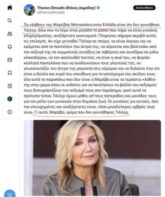 «Σε συνέχεια της χθεσινής συκοφαντικής ανάρτησης της Βουλευτού Επικρατείας του ΣΥΡΙΖΑ Έλενας Ακρίτα, το περιεχόμενο της οποίας επανέλαβε και σήμερα, η κυρία Μαρέβα Γκραμπόφσκι Μητσοτάκη θα προβεί στο αμέσως προσεχές χρονικό διάστημα στις απαραίτητες νομικές ενέργειες κατά το αστικό και ποινικό δίκαιο, με σκοπό την αποκατάσταση της αλήθειας και της προσωπικότητάς της.