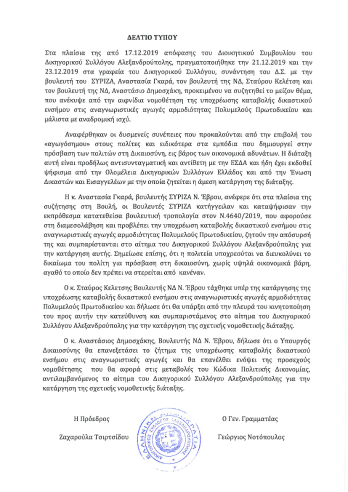 Στο πλευρό του Δικηγορικού Συλλόγου Αλεξανδρούπολης οι βουλευτές του Έβρου για την κατάργηση του δικαστικού ενσήμου