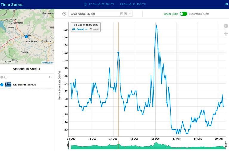 Όπως βλέπετε και στον χάρτη, για παράδειγμα στην πόλη των Σερρών, την 14η Δεκεμβρίου η διακύμανση βρίσκεται στην τιμή των 132 nSv/h ενώ μετά από δύο ημέρες η τιμή εκτοξεύεται στα 139 nSv/h.