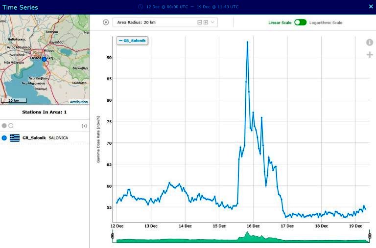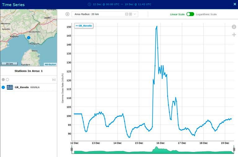 Συγκεκριμένα, στην Καβάλα, όπως βλέπετε και στον χάρτη η τιμή της ραδιενέργειας στις 16 Δεκεμβρίου εκτοξεύτηκε στα 150 nanosivert ανά ώρα ενώ τις υπόλοιπες ημέρες πριν και μετά την 16η Δεκεμβρίου οι τιμές πέφτουν σε χαμηλά επίπεδα.