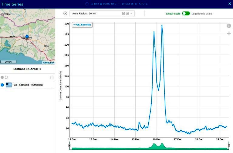 Το ίδιο γίνεται και στην Κομοτηνή όπου οι τιμές στις 16 Δεκεμβρίου φτάνουν περίπου στα 130 nanosivert ανά ώρα, ενώ τις προηγούμενες ημέρες και τις επόμενες οι τιμές πέφτουν κάτω από 90 nanosivert ανά ώρα.