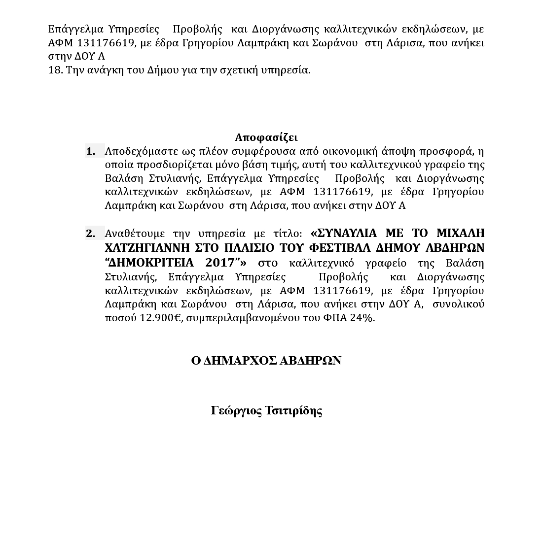 ΠΟΣΟ ΠΛΗΡΩΣΕ ΤΗ ΣΥΝΑΥΛΙΑ ΤΟΥ ΧΑΤΖΗΓΙΑΝΝΗ Ο ΔΗΜΟΣ ΑΒΔΗΡΩΝ ΣΤΑ ΔΗΜΟΚΡΙΤΕΙΑ 2017