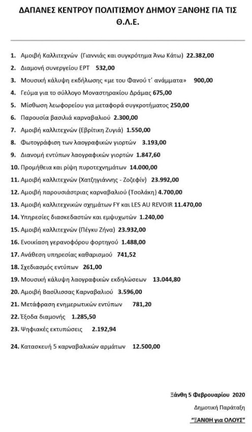 Υπενθυμίζουμε ότι τις ΔΑΠΑΝΕΣ ΤΟΥ ΚΕΝΤΡΟΥ ΠΟΛΙΤΙΣΜΟΥ ΔΗΜΟΥ ΞΑΝΘΗΣ ΓΙΑ ΤΙΣ Θ.Λ.Ε έδωσε πρώτη στη δημοσιότητα στις 5 Φεβρουαρίου η παράταξη Ξάνθη για όλους του Σάββα Μελισσόπουλου και ήταν η παρακάτω: