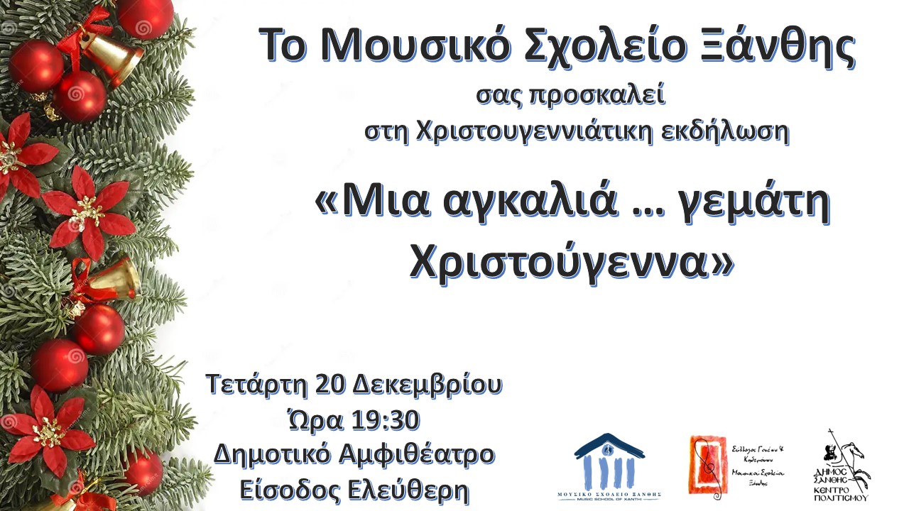 Το Μουσικό Σχολείο Ξάνθης και ο Δήμος Ξάνθης συνδιοργανώνουν ττη Χριστουγεννιάτικη Συναυλία με τίτλο “Μια αγκαλιά γεμάτη… Χριστούγεννα” που θα πραγματοποιηθεί την Τετάρτη, 20 Δεκεμβρίου και ώρα 19:30 στο Δημοτικό Αμφιθέατρο Ξάνθης.