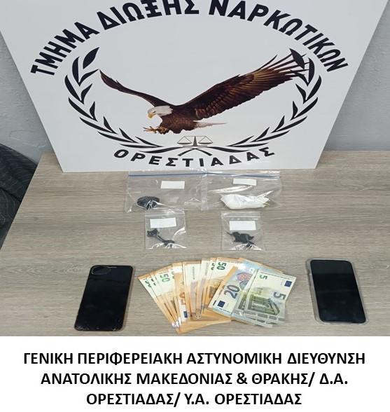 Αναλυτικότερα, στην πρώτη περίπτωση, τις πρώτες πρωινές ώρες στην Ορεστιάδα, αστυνομικοί της Υποδιεύθυνσης Ασφάλειας Ορεστιάδας κατόπιν αξιοποίησης πληροφοριών για διακίνηση ναρκωτικών ουσιών στην ευρύτερη περιοχή του Έβρου συνέλαβαν τον έναν δράστη, διότι σε έρευνα που πραγματοποιήθηκε με τη συνδρομή του αστυνομικού σκύλου «NORMAN» βρέθηκαν στην κατοχή και στην οικία του και κατασχέθηκαν: