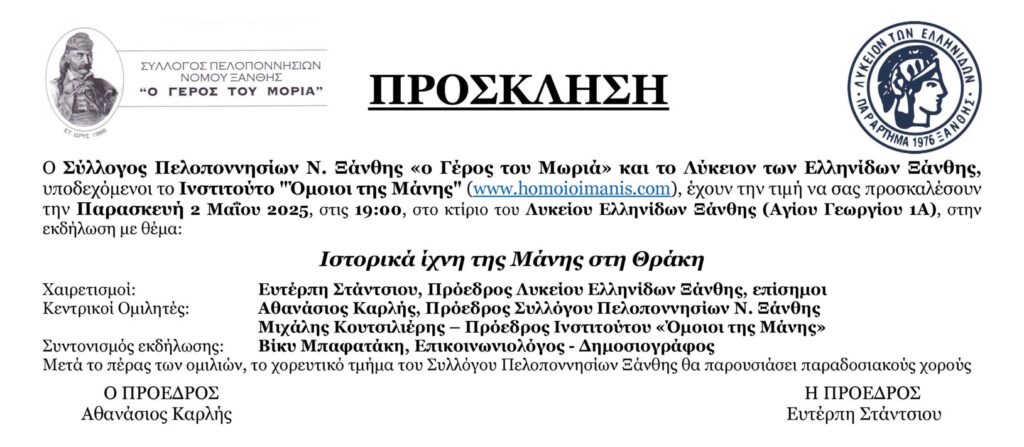 *Ο Σύλλογος Πελοποννησίων Ν. Ξάνθης «ο Γέρος του Μωριά» και το Λύκειον των Ελληνίδων Ξάνθης, υποδεχόμενοι το Ινστιτούτο “Όμοιοι της Μάνης” (www.homoioimanis.com), έχουν την τιμή να σας προσκαλέσουν την Παρασκευή 2 Μαΐου 2025, στις 19:00, στο κτίριο του Λυκείου Ελληνίδων Ξάνθης (Αγίου Γεωργίου 1Α), στην εκδήλωση με θέμα: «Ιστορικά ίχνη της Μάνης στη Θράκη».