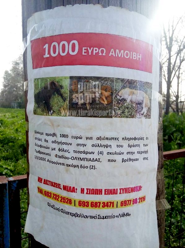 Η σχετική αφίσα έξω από την είσοδο του Σταδίου από την μεριά του ΟΑΕΔ αναφέρει ότι έχουν σκοτωθεί ήδη τέσσερα σκυλιά ενώ άλλα αγνοούνται.