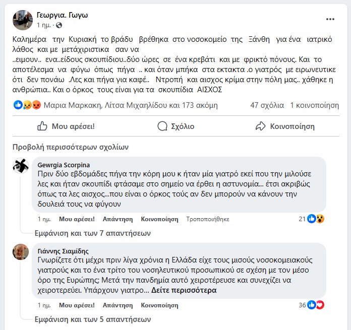Όλοι περνάμε από εκεί Όταν γίνονται συναντήσεις κ πορείες πρέπει να ακούγονται αυτές η φωνές όχι μόνο να πληκτρολογούμε. Υπάρχουν γιατροί κ μιλάω για Ξάνθη που κάνουν τριήμερες εφημερίες ίσως και περισσότερες .Για αυτό στην επόμενη διαμαρτυρία να είμαστε όλοι εκεί».