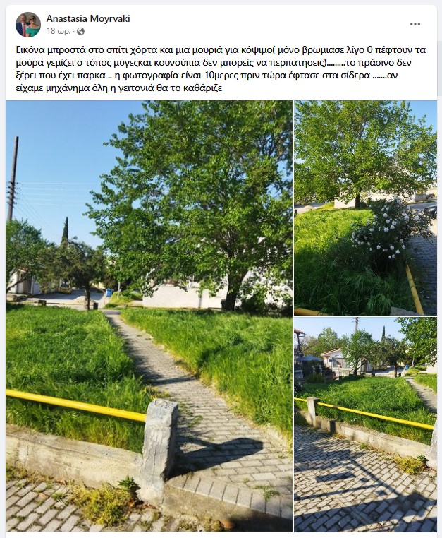 Εικόνα μπροστά στο σπίτι χόρτα και μια μουριά για κόψιμο( μόνο βρωμιασε λίγο θ πέφτουν τα μούρα γεμίζει ο τόπος μυγεςκαι κουνούπια δεν μπορείς να περπατήσεις)… το πράσινο δεν ξέρει που έχει παρκα… η φωτογραφία είναι 10μερες πριν τώρα έφτασε στα σίδερα… αν είχαμε μηχάνημα όλη η γειτονιά θα το καθάριζε