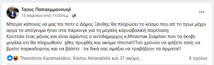 Μπορεί κάποιος να μας πει πότε ο Δήμος Ξάνθης θα πληρώσει το κόσμο που απ’ το πρωί μέχρι αργά το απόγευμα ήταν στα πάρκινγκ για τη μεγάλη καρναβαλική παρέλαση;