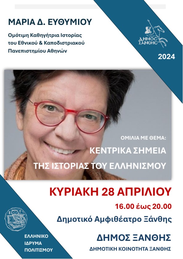 *Ανακοίνωση. Ο Δήμος Ξάνθης και η Δημοτική Κοινότητα Ξάνθης, σας προσκαλούν στην ομιλία της Μαρίας Ευθυμίου, Ομότιμης καθηγήτριας Ιστορίας του Εθνικού &  Καποδιστριακού Πανεπιστημίου Αθηνών, την Κυριακή 28 Απριλίου 2024 στις 16.00, με θέμα: Κεντρικά σημεία της ιστορίας του Ελληνισμού  Η εκδήλωση θα πραγματοποιηθεί στο Δημοτικό Αμφιθέατρο Ξάνθης.